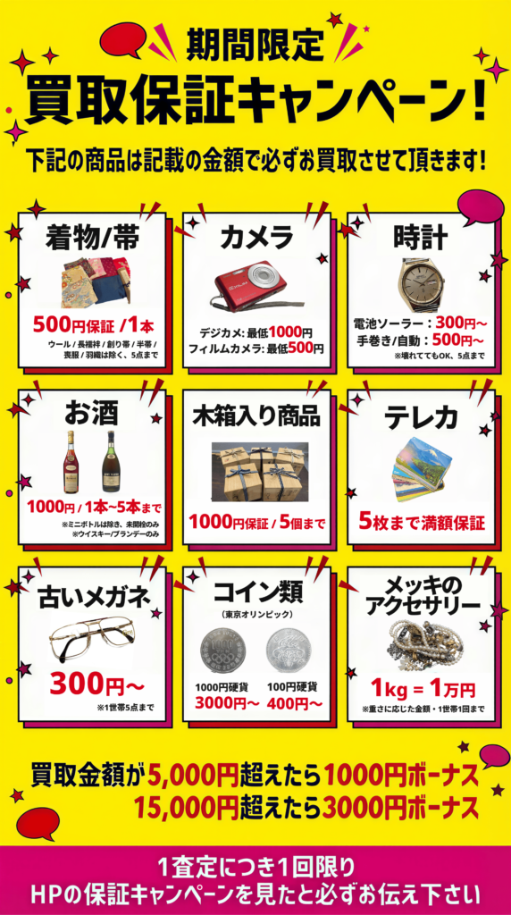 A. 生き物以外の全ての品目が買取対象になりますが、品物の状態、年式などによって金額がつかないものもございます。詳しくお知りになりたい方は、査定員に直接お聞きください。
