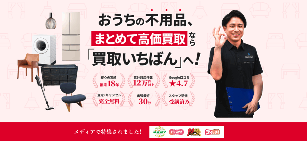 買取いちばんドットコムは、家電やブランド品を幅広く扱う総合買取サービスです。