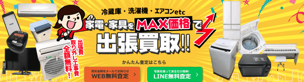 出張買取MAXは、テレビなどの大型家電に特化した買取サービスです。出張費・査定料が無料で、最短で申し込んだその日のうちに訪問してくれるスピード対応が強み。運搬が難しい大型テレビや、他店で断られた古いテレビでも、リユース可能な場合は買い取ってもらえる可能性があります。LINEを使った事前査定も利用でき、手軽に概算金額を知ることも可能です。
