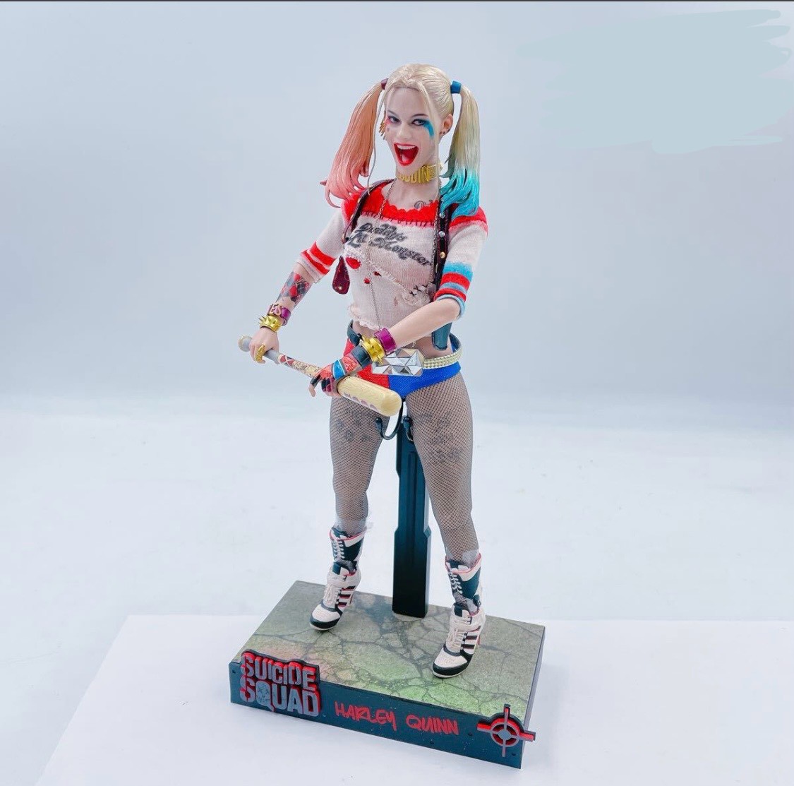 専用スタンドには「SUICIDE SQUAD」のロゴ入りで、飾るだけでインパクトのあるコレクションに。安定感も良く、自宅展示にも最適です。